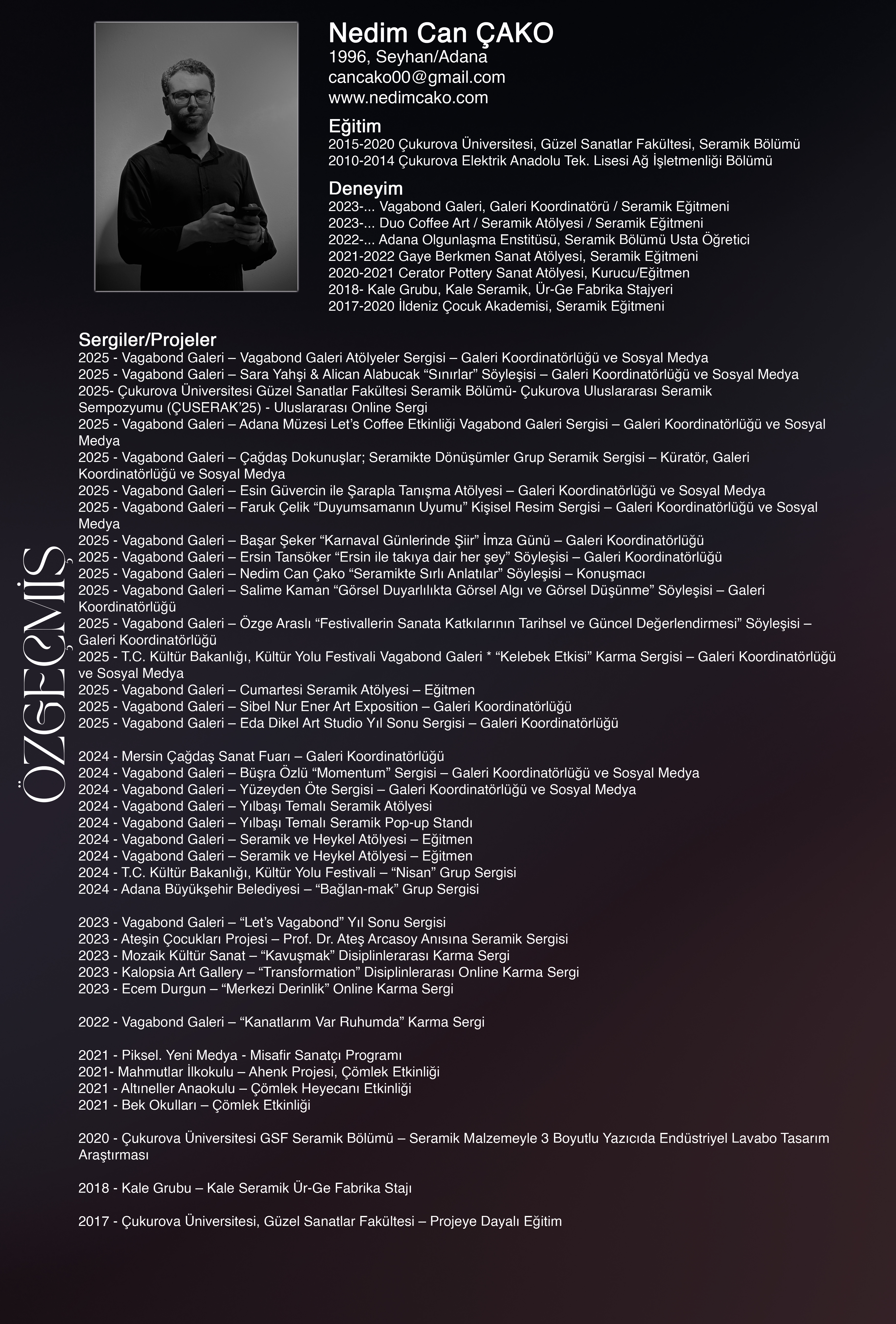 Nedim Can Çako 1996’da Adana’nın Seyhan ilçesinde doğmuştur. 2020’de Çukurova Üniversitesi Güzel Sanatlar Fakültesi Seramik Bölümü mezunu olup, öğrenimine devam ederken başladığı atölye ve etkinlik çalışmalarıyla birlikte, sanat atölyelerinde eğitimler vermektedir. Olgunlaşma Enstitülerinde tema kapsamında üretimlerle birlikte, Vagabond Galeri’deki seramik stüdyosunda çalışmalarına devam etmektedir.